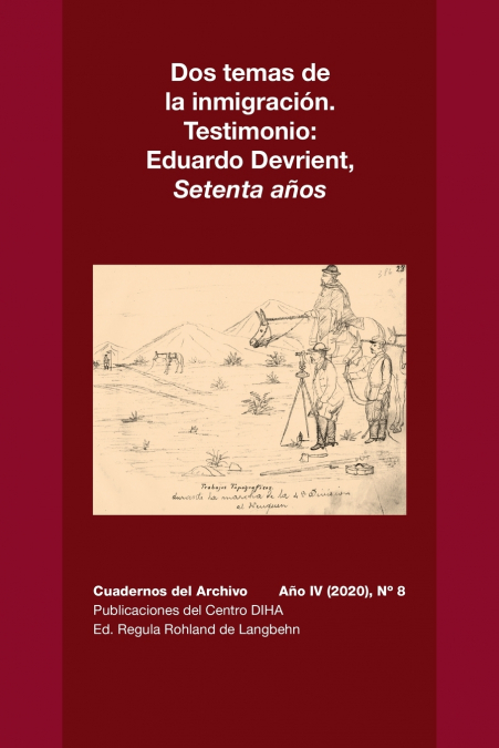 El Cuaderno reune tres temas de diferente índole, cada uno de los cuales vale como una incitación a la lectura. La historiadora de imágenes Inés Yujnovsky analiza un conjunto de imágenes de Francisco Host, quien partici- pó entre 1873 y 1886 como o cial del Cuerpo de Ingeniería en las llamadas campañas al desierto, tanto en la frontera patagónica como en el Chaco. En el cuaderno se reproducen algunos de sus dibujos y mapas. El artículo del historiador Juan Morello tiene por objeto analizar el concepto de alemanidad para la comunidad científica alemana en Buenos Aires durante el período de entreguerras (1919-1939). El análisis de larevista Phoenix órgano de difusión de la Asociación Científica Alemana en Argentina permite entrever losvaivenes, cambios y continuidades de los sentimientos que giraron en torno a la alemanidad y que se plasmaron en diferentes asociaciones. La parte más extensa del tomo se dedica a editar en castellano las memorias de Eduardo Devrient, un inmigrado de 1890. Describe la vida en el campo por aquellos años en los que recién se comenzaba a cultivar la tierra de la provincia de Buenos Aires y a criar ganado cada vez con mayor profesionalismo. En Córdoba vivió apostando a hipotecas y préstamos, que eventualmente lo condujeron al fracaso económico, pero comprendemos como lectores que detrás de la especulación con dinero prestado y de la consiguiente frustración se escondía el gran anhelo de volver a la carrera artística truncada en los comienzos de su intensa vida.