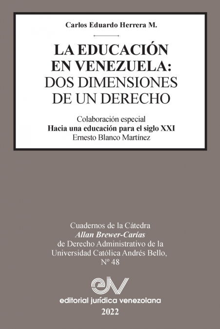 La Educación en Venezuela: dos dimensiones de un derecho, es un trabajo de investigación del abogado y docente Carlos Eduardo Herrera M., que aborda con profundidad uno de los temas capitales de la sociedad venezolana. Bien lo dice en el importante prólogo el distinguido profesor Allan R. Brewer-Carías que las reflexiones que deja esta obra, sin duda servirán para las reformas que en materia educativa deban realizarse en el futuro. ,El trabajo parte del análisis de ,las dos dimensiones del derecho a la educación: la prestacional u objetiva que obliga al Estado a brindar a la población una educación gratuita y de calidad y la dimensión de la educación en libertad, o libertad de enseñanza por medio del cual las familias pueden ejercer con plena libertad su derecho a elegir entre una pluralidad de escuelas que reflejen la diversidad de la sociedad. La libertad de educación solo será efectiva si las escuelas privadas pueden acceder a financiamiento público o a mecanismos alternativos de inversión.
