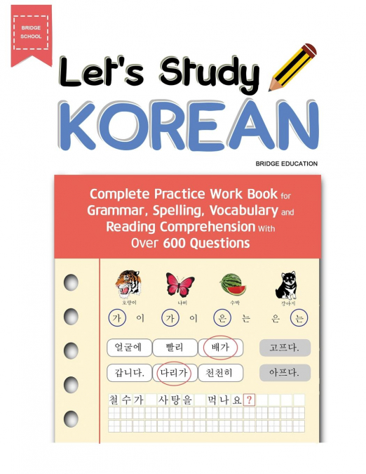 Let&rsquo,s Study Korean &ndash, Complete Work Book for Grammar, Spelling, Vocabulary, and Reading Comprehension is an essential supplement for your Korean study needs as it brings a carefully designed set of questions covering Korean grammar, Hangul spelling, vocabulary drills, and reading comprehension. They are structured in an ascending-level to help your learning experience. They start easy, but become more challenging as you progress towards the end, which is an effective way to build a thorough understanding of the language. Each part is composed of a set of multiple questions and writing questions to develop a strong balance between reading, writing, and comprehension.