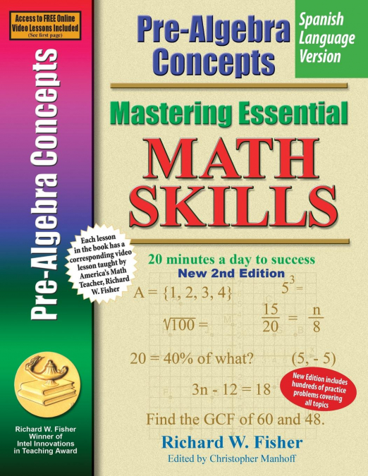 SPANISH LANGUAGE VERSION. Includes video tutorials. One for each lesson.  ,THIS IS THE NEW IMPROVED, EXPANDED, 2ND EDITION. IT NOW CONTAINS EXTRA PRACTICE PROBLEMS FOR EACH TOPIC. THESE PROBLEMS WILL ENSURE MASTERY OF ALL TOPICS IN THE BOOK. THERE ARE HUNDREDS OF THIS PROBLEMS.<,P>,Used by hundreds of thousands of students each year.<,P>, , Pre-Algebra Concepts includes free online video tutorials. One for each lesson in the book.<,P>, Lessons are presented in a format that everyone can easily understand.<,P>,  ,Each Lesson flows smoothly and logically to the next.<,P>,  ,Each lesson is short, concise, and to the point.<,P>,  ,Lots of examples with step-by-step solutions.<,P>,  ,Each lesson includes valuable Helpful Hints<,P>,  ,Review is built into each lesson. Students will retain what they have learned.<,P>,  ,Each lesson includes Problem Solving. This ensures that students will learn to apply their knowledge to real-life-situations.<,P>,  ,Excellent prep for SAT/PSAT<,P>,  ,Topics:<,P>, Sets<,P>, Positive and Negative Fractions<,P>, Positive and Negative Decimals<,P>, Exponents<,P>, Square Roots<,P>, Order of Operations<,P>, Properties of Numbers<,P>, Scientific Notation<,P>, Ratios &, Proportions<,P>, Percents<,P>, Number Theory<,P>, Number Lines<,P>, Coordinate Planes<,P>, Slope of a Line<,P>, Graphing Equations<,P>, Solving Algebraic Equations<,P>, Algebraic Word Problems<,P>, Probability<,P>, Statistics<,P>,  ,Includes Solutions, A Glossary, and a Resource Center